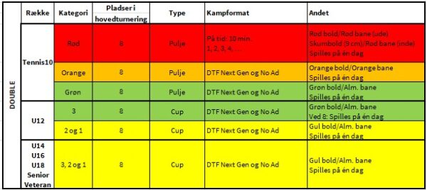 - Spillere kan godt deltage i double med spillere fra andre aldersgrupper. Doubleparret deltager i den række, som den ældste spiller tilhører. Det gælder dog stadig, at U10 kun kan deltage i U10 og U12 kun kan deltage i U12 og U14.