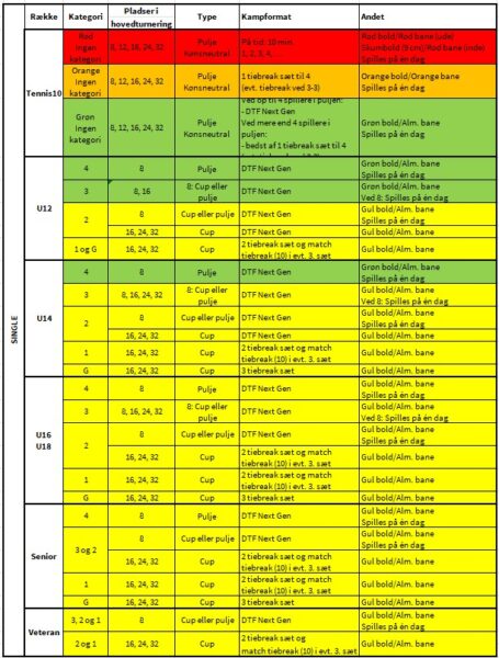 - Hvis to turneringer har samme kategori sættes spilleren ind i den turnering, hvor spilleren har markeret sin højeste prioritet ved tilmelding.